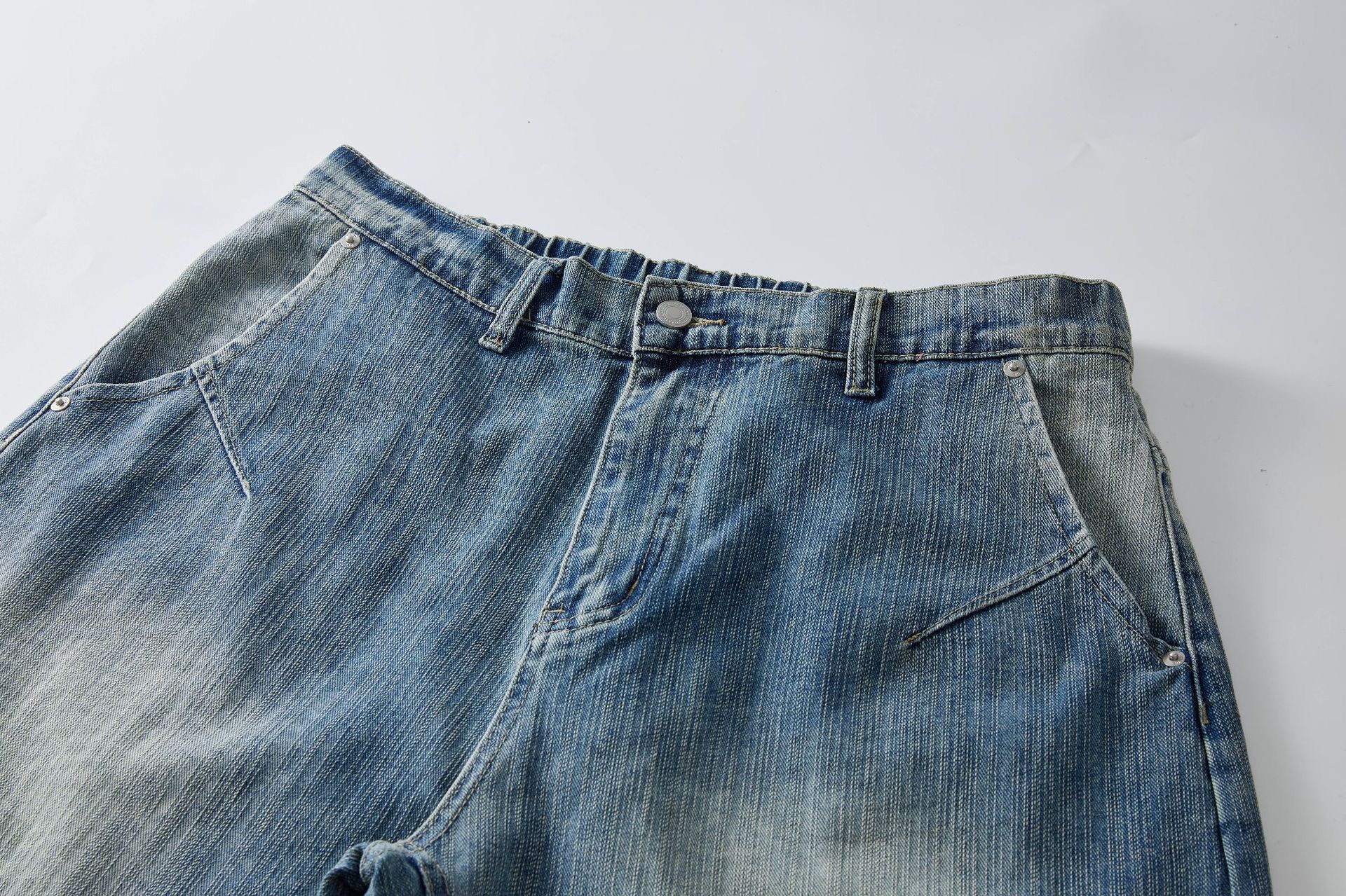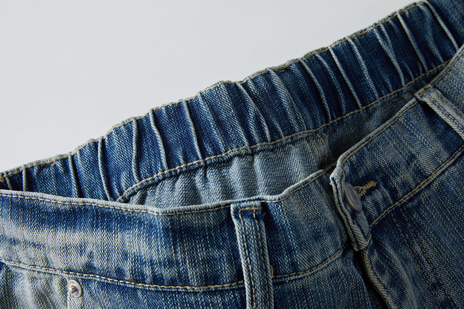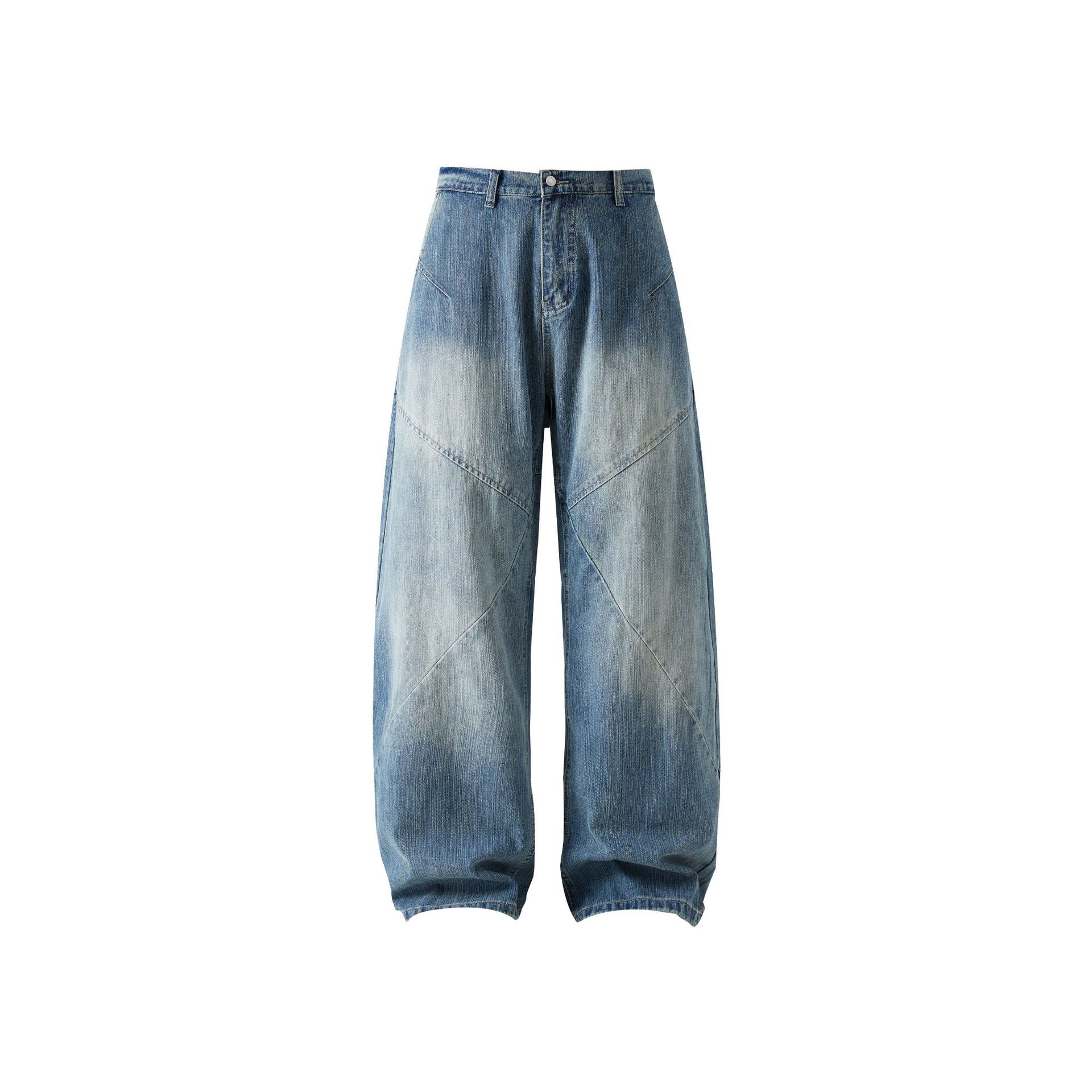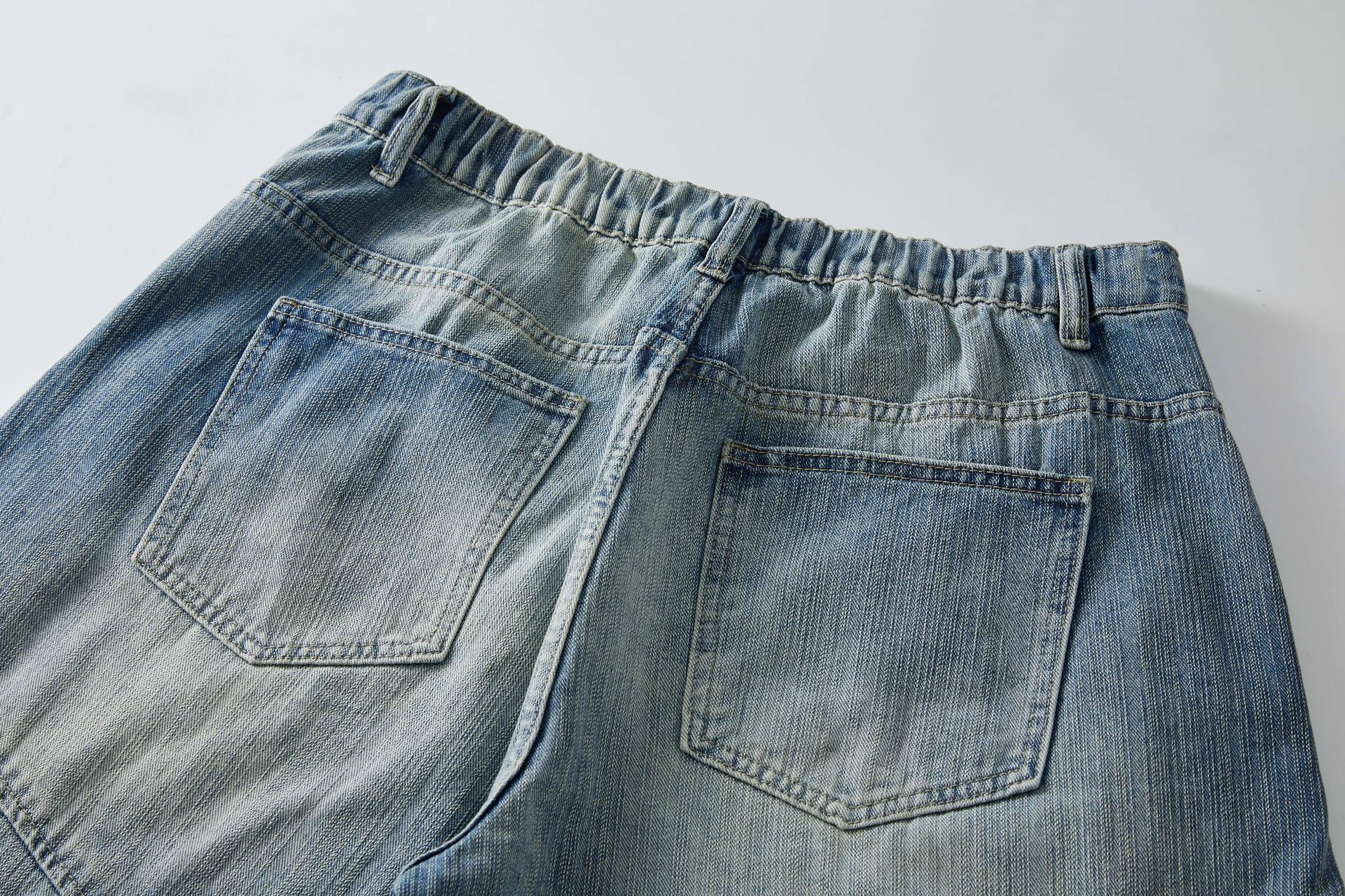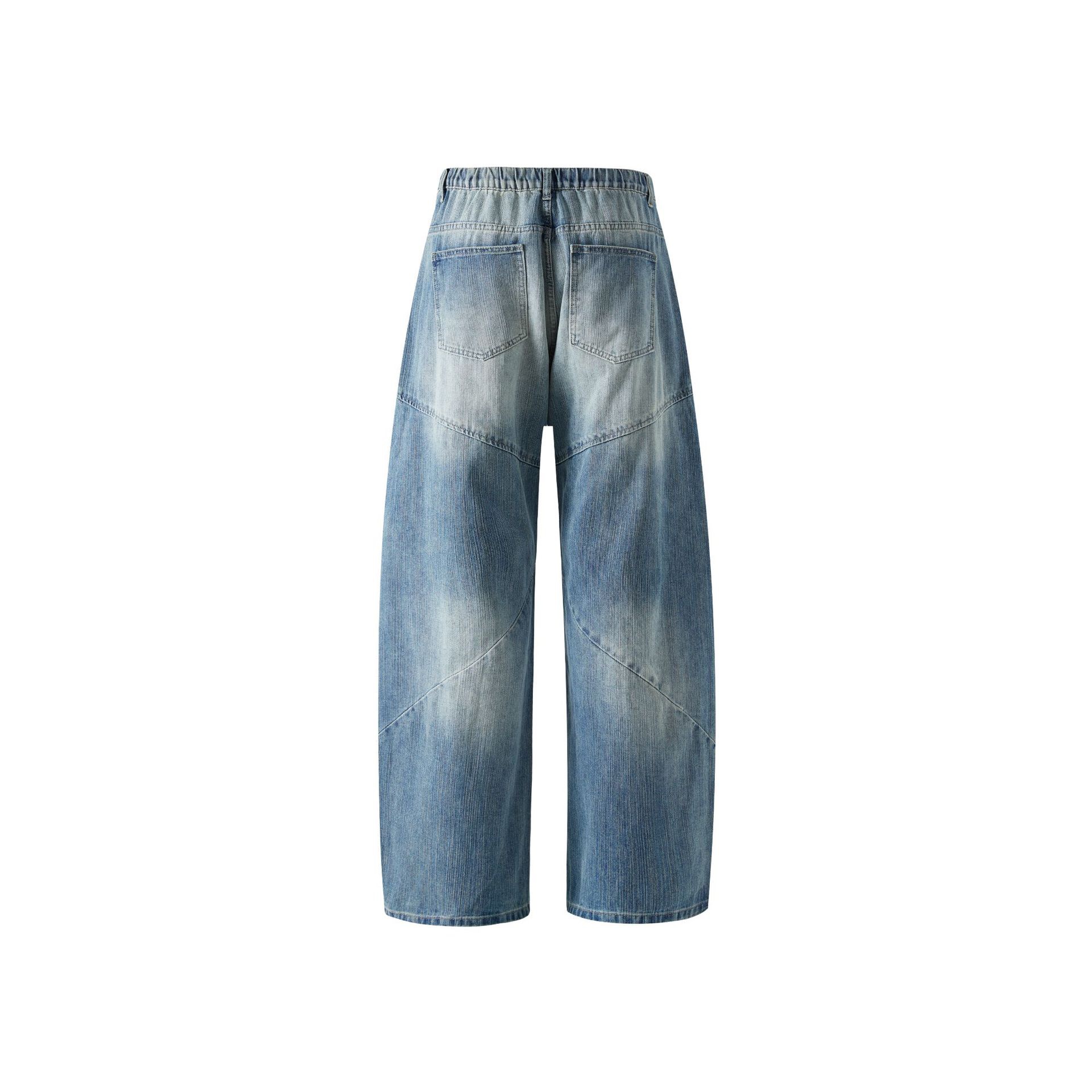 痞帥街頭風 竹節拼接牛仔褲 水洗舊復古藍 寬鬆直通|後腰鬆緊