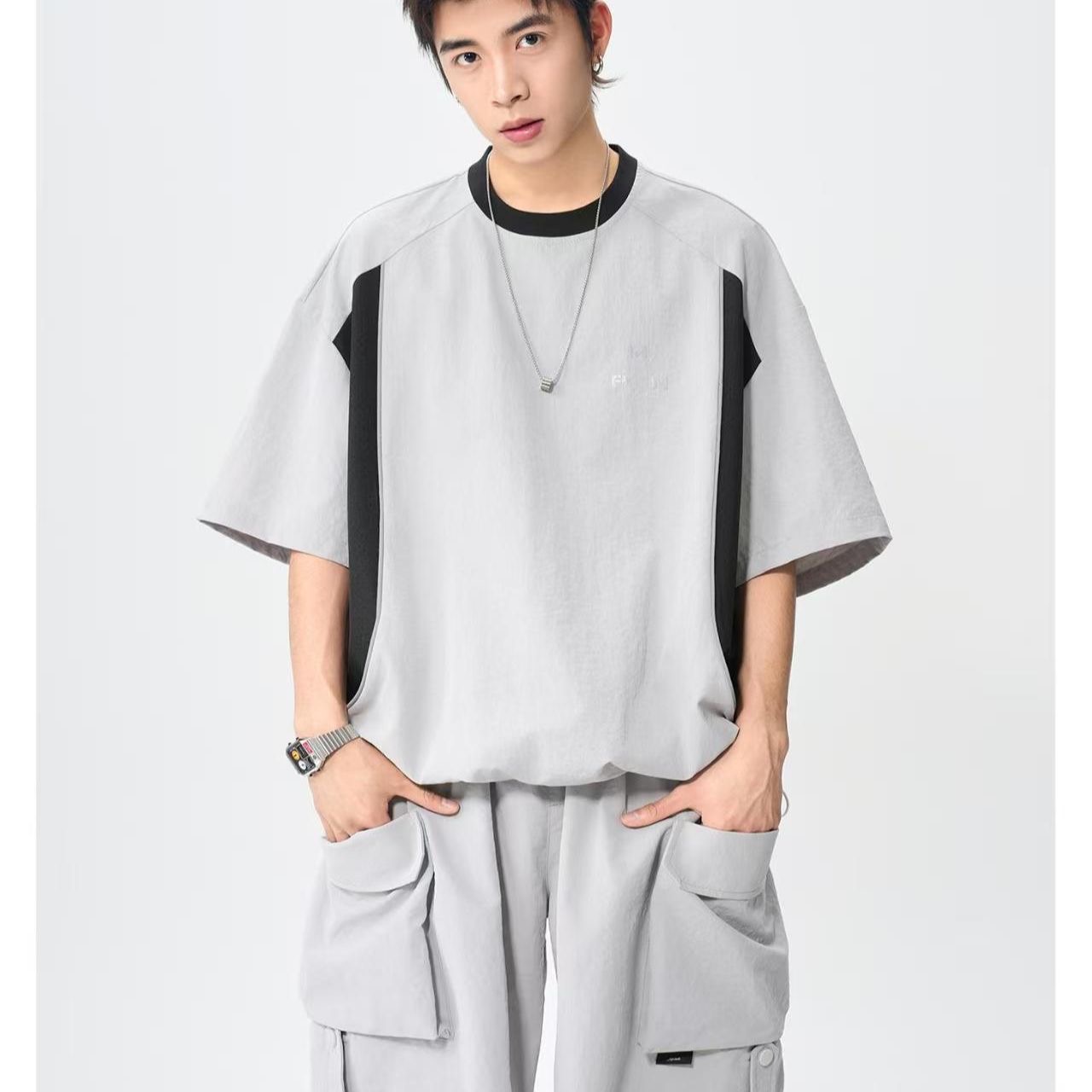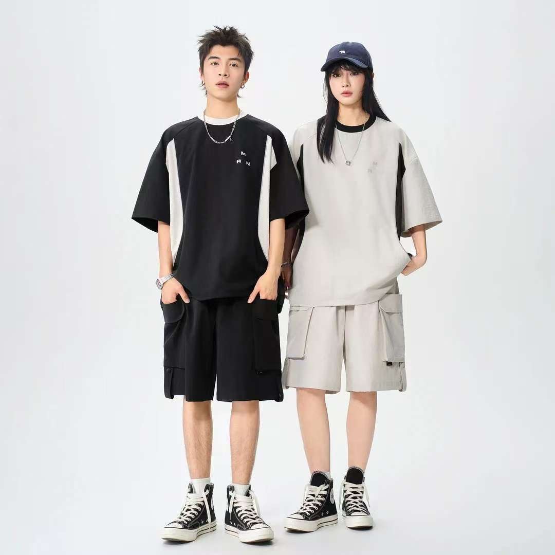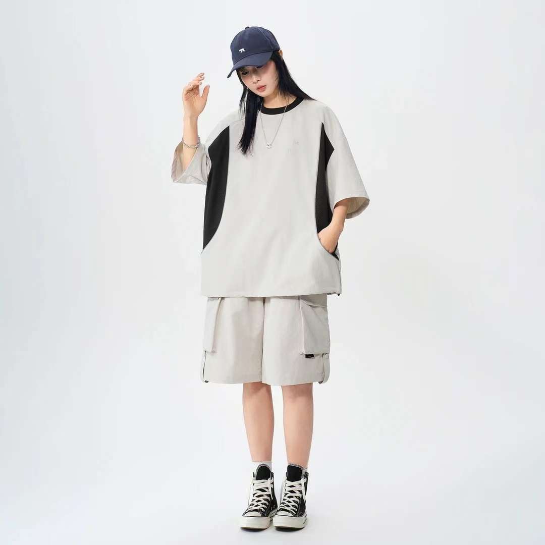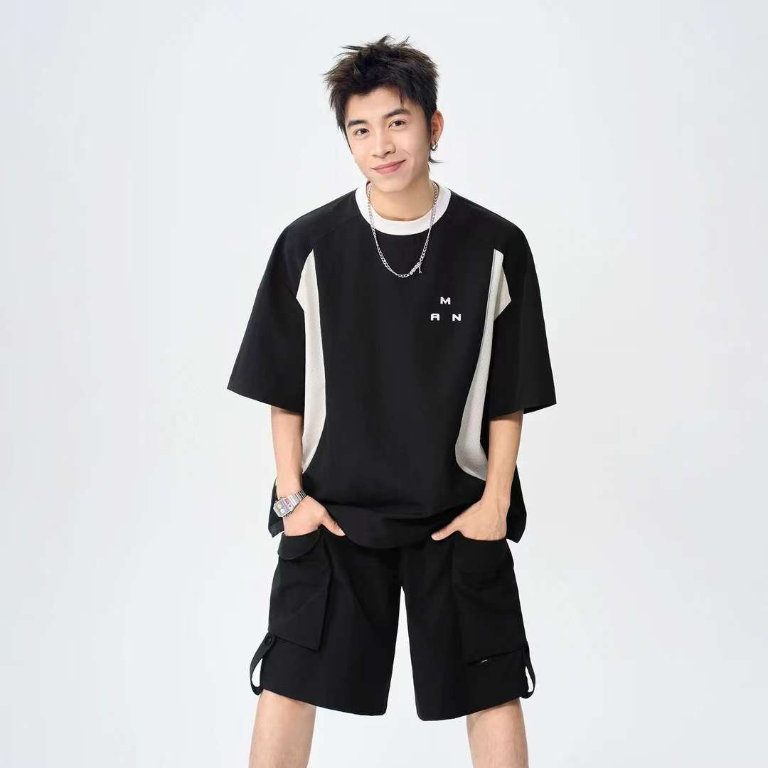 MAN 美式速干運動套裝 圆领拼色上衣+鬆緊腰工裝短褲|寬鬆休閒凉感
