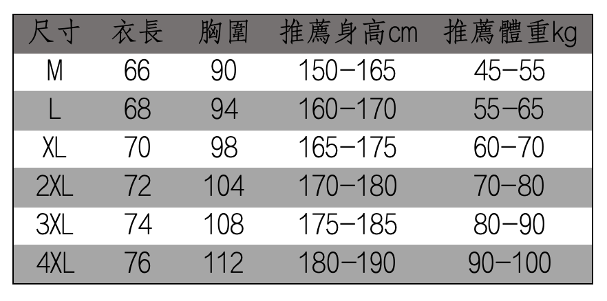 六種尺碼:M、L、XL、2XL、3XL、4XL